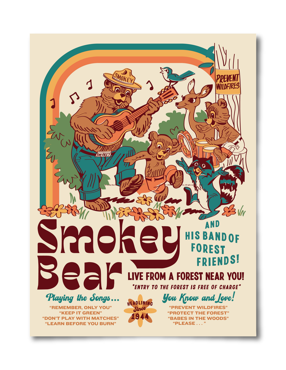 Designed in the style of a vintage music festival poster, Smokey's Band features Smokey Bear and his forest friends taking center stage in a concert for the great outdoors. With playful nods to hits like “Only You Can Prevent Wildfires” and “Keep it Green,” this artwork celebrates 80 years of Smokey’s message in style. Hang it up and let the spirit of the forest (and a little nostalgia) liven up your space.